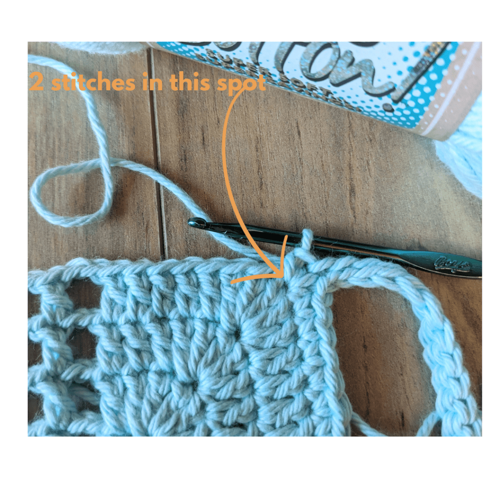 - Rnd 6: Ch 3 (counts as 1 dc), 1 dc in next 4 dc, 5 dc in next dc,* 1 dc in next 5 dc, ch2, 1 dc in next dc, ch2, 1 dc in next 5 dc, 5 dc in next dc, rep from * twice, 1 dc in next 5 dc, ch 2, 1 dc in next dc, ch 2, Join with sl st in top of ch 3. (64 Dc, 8-ch 2 spaces)